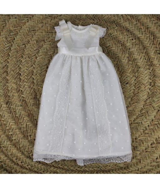 Batón color beige con detalles de topos bordados en tul, tiras de encaje y lazos en los hombros y atrás.