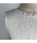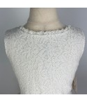 Vestido de manga sisa color blanco roto con detalles de tiras bordadas en el cuello y en la cintura en color blanco roto.