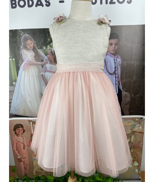 Vestido de tul color piedra y rosa con detalle de flores en los hombros.