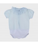Bodi de manga corta de plumeti con cuello volante. Color blanco y celeste.