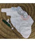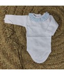 Bodi de manga corta de plumeti con cuello volante. Color blanco y celeste.