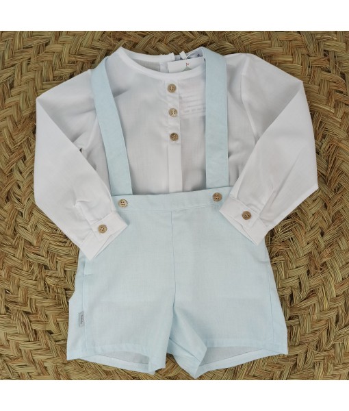 Conjunto de dos piezas para niño. Camisa blanca de manga larga con botones. Pantalón corto con tirantes de color lino. También disponible en color rosa maquillaje y en color verde jade.