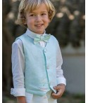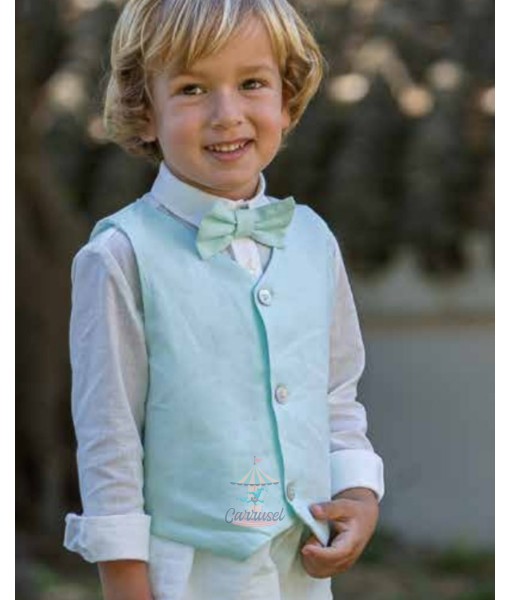 Conjunto de tres piezas de lino. Camisa de manga larga de color blanco, chaleco y pantalón corto de color verde agua. Incluye pajarita a juego.