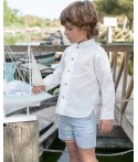 Conjunto de dos piezas para niño. Camisa blanca de manga larga con botones. Pantalón corto con tirantes de color lino. También disponible en color rosa maquillaje y en color verde jade.