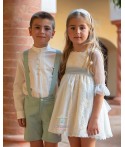 Vestido de manga corta de color beige con tul de color verde jade con detalles de bordados y topos.