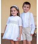 El conjunto para niño incluye una elegante camisa de manga larga en color beige con un moderno cuello mao, que ofrece un estilo sofisticado y atemporal. Acompañada de un pantalón corto de estampado vichy en negro, este conjunto combina a la perfección la elegancia clásica con un toque contemporáneo. La camisa, confeccionada con tejidos de alta calidad, proporciona comodidad y estilo, mientras que el pantalón de vichy añade un contraste dinámico y fresco, ideal para eventos especiales o para un look casual con un toque chic.