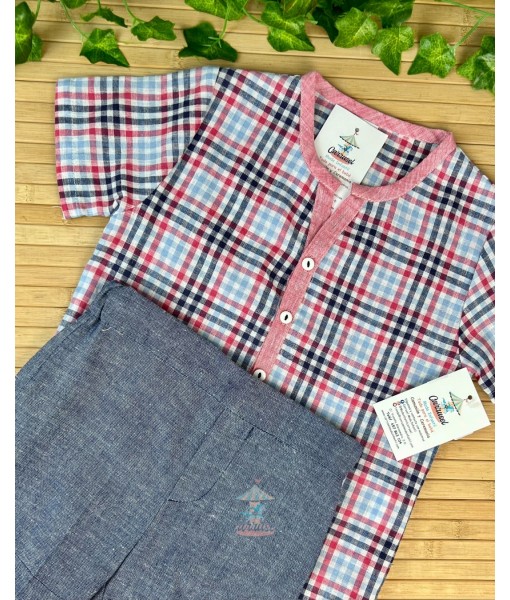 Conjunto de manga corta y pantalón corto. Camisa de manga corta de cuadros de color rosjo y azul. Pantalón corto de color denim oscuro.