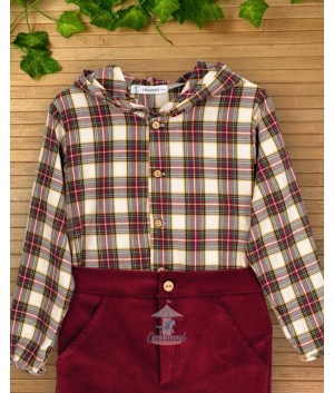 Este elegante conjunto para niño combina un pantalón corto en tono burdeos con una parte superior de manga larga de cuadros en burdeos y lino, complementada con una capucha para un toque moderno. El diseño mezcla la sofisticación del color burdeos con la suavidad del lino, creando un look versátil y estiloso, ideal para ocasiones especiales donde se desea un equilibrio entre formalidad y comodidad.