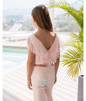 Un encantador top para niña en color rosa, diseñado con una elegante espalda en forma de "V" que aporta un toque moderno y femenino. Los volantes de tul en los hombros y la espalda añaden un delicado detalle de fantasía, creando un look etéreo y sofisticado. Este top es perfecto para ocasiones especiales o para darle un aire chic a cualquier conjunto diario, asegurando que cada niña se sienta única y con estilo.