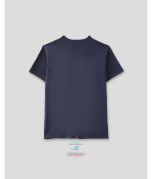 Camiseta de niño de algodón en color azul. Manga corta y cuello redondo ribeteado. Estampado grande de iguana y letras "MEXICAN ADVENTURE EST.: 1953 CNDH" en la parte delantera.