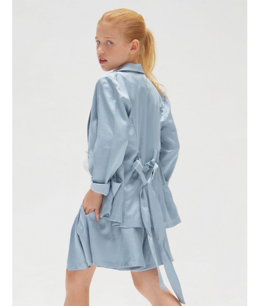 Chaqueta de satén de color acero con bolsillos.