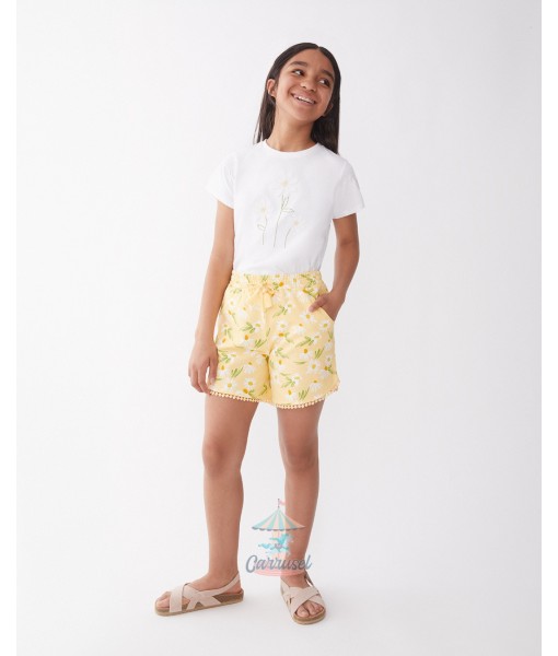 Los shorts, en un vibrante color amarillo, se destacan por su alegre estampado de margaritas y su diseño fluido. La cintura elástica, adornada con un lazo decorativo, asegura un ajuste perfecto, mientras que el ribete de puntilla en el dobladillo añade un acabado encantador.