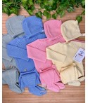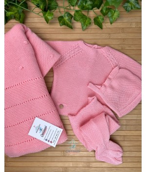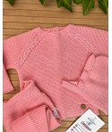 Conjunto de tres piezas de hilo. Capota, jersey con detalles de trenzado y polaina de hilo de color coral.