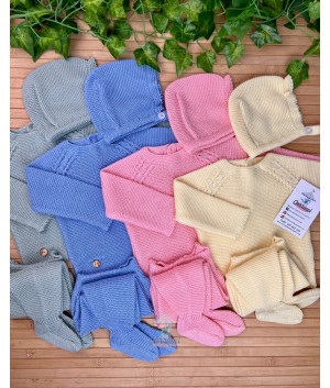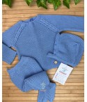 Conjunto de tres piezas de hilo. Capota, jersey con detalles de trenzado y polaina de hilo de color azulado.