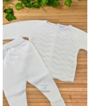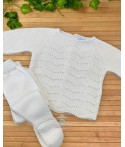 Este encantador conjunto de punto, disponible en hilo de color nata, rosa o celeste, es la elección perfecta para un look dulce y sofisticado. El conjunto incluye una polaina y un jersey con cuello volante adornado con delicados bordados, aportando un toque elegante y encantador. Confeccionado en un tejido suave y cómodo, es ideal para que los más pequeños luzcan con estilo en cualquier ocasión especial, asegurando que se sientan cómodos mientras destacan con un aire de ternura y elegancia.