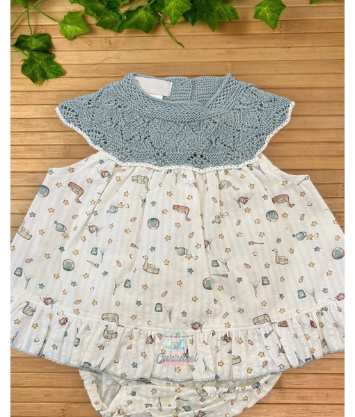 Este encantador conjunto de punto de dos piezas combina elegancia y comodidad para las más pequeñas. El vestido presenta una parte superior tejida en hilo de color verde bruma, que aporta un toque de suavidad y frescura. La falda, confeccionada en tela, destaca con un delicado estampado de estrellas y juguetes, añadiendo un aire lúdico y encantador al atuendo. Para completar el conjunto, se incluye una braga a juego, asegurando que cada detalle esté perfectamente coordinado. Ideal para cualquier ocasión, este conjunto es una opción maravillosa para que tu niña luzca dulce y sofisticada.