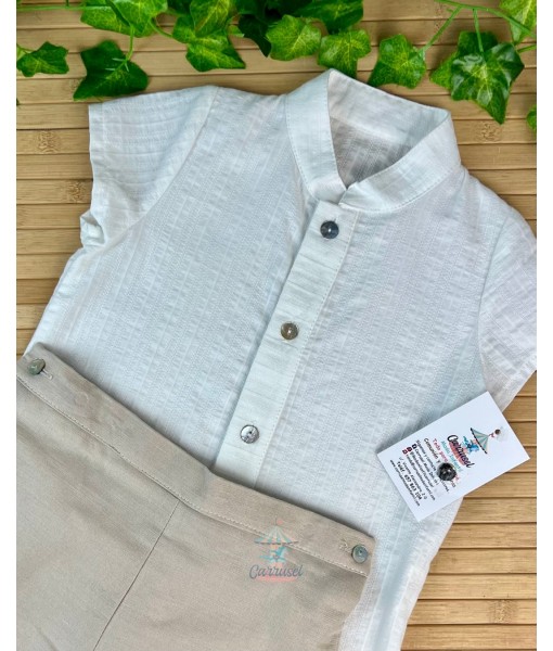 Conjunto de manga corta. Camisa de color blanco roto, con cuello maho y detalles de líneas. Pantalón corto de color lino con cintura elástica.