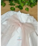 El batón de ceremonia de plumeti blanco es una pieza exquisita que destaca por su elegancia y delicadeza. Confeccionado en un tejido ligero, presenta finos detalles de bordados que aportan un toque sofisticado. El complemento perfecto lo constituye un fajín de tul rosa con una elegante lazada, añadiendo un contraste suave y encantador al diseño. La capota a juego completa este conjunto ideal para ocasiones especiales, asegurando que la pequeña luzca adorable y con estilo en su día especial.