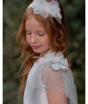 Mono beige de manga sisa con volante de tul de color verde jade.