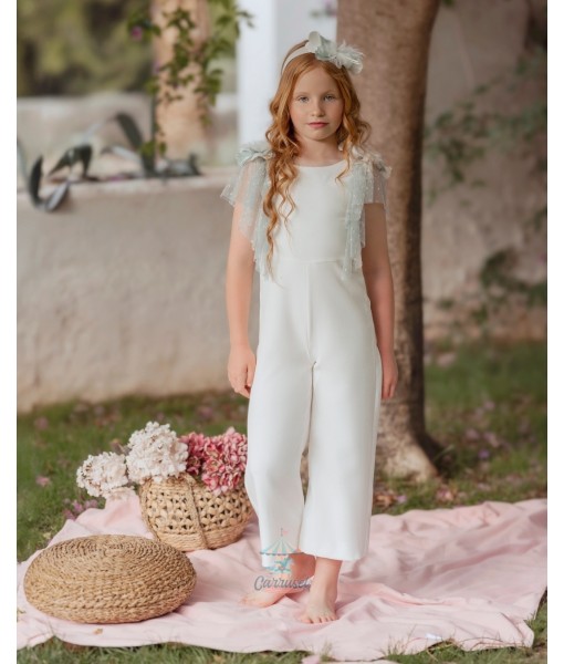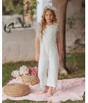 Este mono para niña, disponible en tonos de blanco roto o verde oliva, está confeccionado en lino, ofreciendo un equilibrio perfecto entre estilo y comodidad. Sus tirantas y el detalle de cuello volante añaden un toque de encanto y delicadeza, mientras que el pantalón largo proporciona una silueta elegante y fluida. Ideal para ocasiones especiales o para un look veraniego sofisticado, este mono es una elección versátil que combina naturalidad y sofisticación.