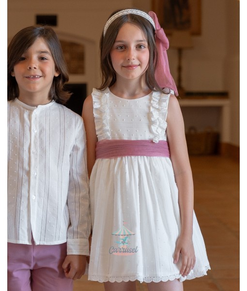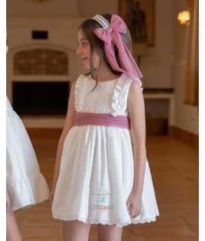 El vestido de lino de color blanco es una pieza elegante y delicada, ideal para ceremonias y eventos especiales. Presenta un diseño encantador con detalles de volantes que añaden un toque de sofisticación y movimiento al conjunto. El vestido se completa con un fajín de tul en tono verde oliva, que se anuda en un lazo en la espalda, proporcionando un contraste sutil y elegante al diseño. Esta prenda combina estilo y comodidad, asegurando que la niña que lo vista se sienta especial y radiante.