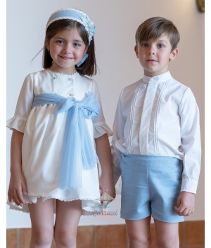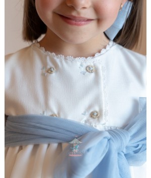 Un elegante vestido blanco con manga francesa, embellecido con volantes y un delicado detalle de puntilla, ofrece un toque sofisticado a cualquier ocasión especial. El diseño se completa con un fajín de tul en color celeste, adornado con un lazo, que añade un contraste sutil y encantador al conjunto, haciendo que cada niña luzca con gracia y distinción. Ideal para ceremonias, este vestido combina estilo clásico con detalles modernos, asegurando que las pequeñas brillen con luz propia.