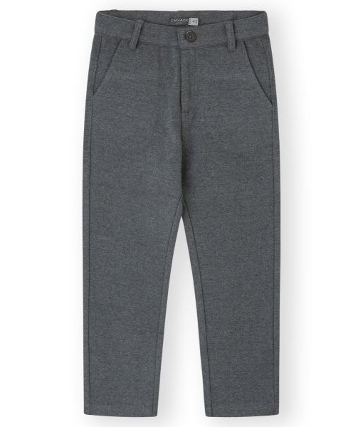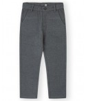 Pantalón de niño en tejido de franela, en color gris, con bolsillos laterales y traseros, goma ajustable en cintura y abertura mediante botón y cremallera.