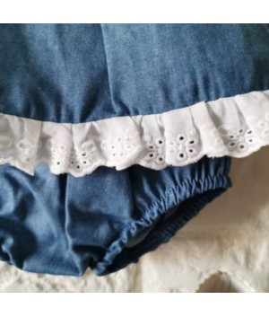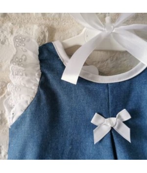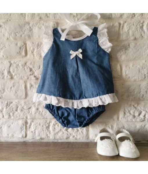 Conjunto de dos piezas de manga sisa con detalles de tiras de volantes perforados. Color denim.