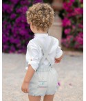 Conjunto de dos piezas para niño. Camisa blanca de manga larga con botones. Pantalón corto con tirantes de color lino. También disponible en color rosa maquillaje y en color verde jade.