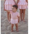 Pelele manga corta con volante en la manga de color blanco y detalle de flores en los laterales.