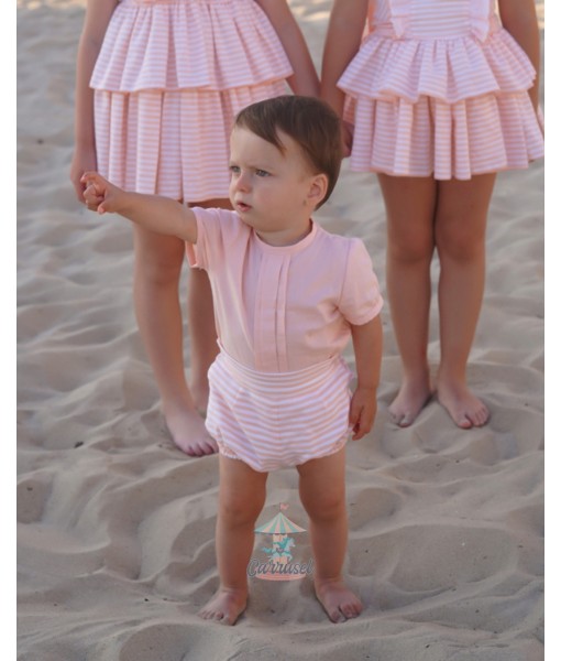 Conjunto de dos piezas de manga corta. Camisa de manga corta de color mandarina con botones en la parte trasera y detalle de jaretas en la parte delantera. Braga de rayas con cintura elástica.