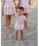 Pelele de plumeti con manga sisa y estampado de florecillas. Color beige. Detalles de lazo y tira de encaje.