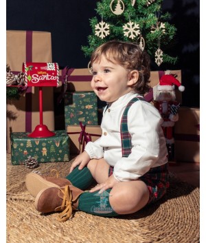 Este conjunto de bebé combina un pantalón corto de cuadros en tonos verde botella y burdeos con elegantes tirantes, junto a una camisa de manga larga en color blanco, que presenta un sofisticado cuello mao. Este conjunto es ideal para ocasiones especiales, ya que equilibra un estilo clásico con un toque moderno, asegurando que el pequeño destaque con encanto y elegancia en cualquier evento.