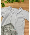 Conjunto de dos piezas de manga larga. Parte superior de color liquen con cuello bebé y detalle de volante y pato bordado. Braga de color blanco con estampado.