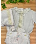 Conjunto de tres piezas. Camisa de manga larga de color celeste con detalles de encaje beige. Capota y braga a juego.
