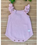 Pelele de tirantes de color rosa empolvado con detalle de volantes y de relieve en la parte frontal. Apertura de botones.