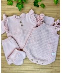 Conjunto de dos piezas de punto de tricotosa. Parte superior de color rosa empolvado con detalle de botones, volantes y relieve en la parte frontal. Abotonado por la parte trasera. Polaina a juego.