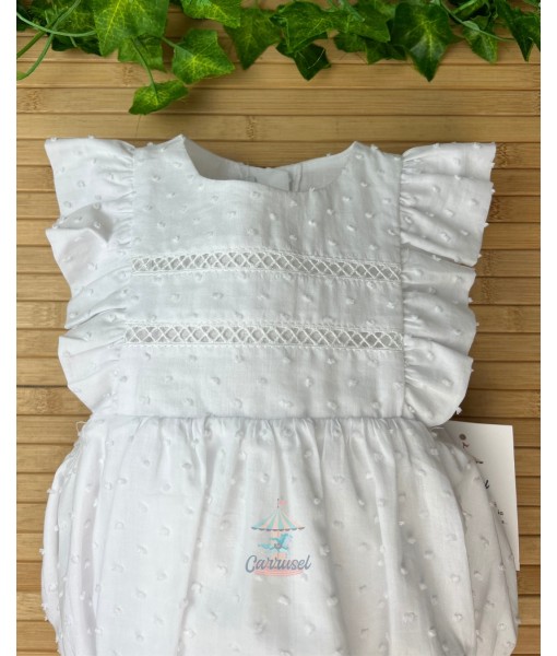 Este encantador pelele de bebé para ceremonia, en un delicado color beige, presenta manga sisa y está adornado con tul bordado de topos y tiras bordadas con flores, aportando elegancia y dulzura. Su diseño incluye prácticas aperturas en la espalda y entrepierna, aseguradas con botones para mayor comodidad. El conjunto se completa con una capota a juego, decorada con los mismos detalles bordados, haciendo de este traje una opción perfecta para que tu bebé luzca sofisticado y adorable en ocasiones especiales.