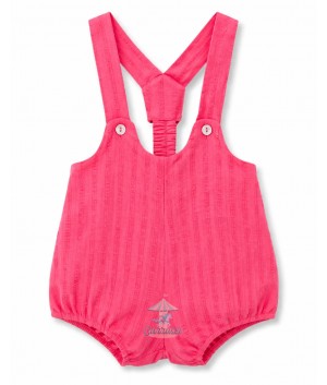 Pelele para bebé en color coral con tejido ligero texturizado y tirantes con botones. Cómodo, fresco y perfecto para los días de verano.
