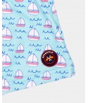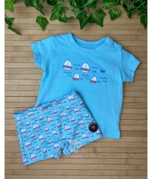 Conjunto baño de dos piezas. Camiseta blanca de manga corta con velero y bañador bóxer celeste con estampado.