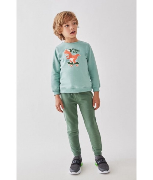 Conjunto de chándal afelpado. Sudadera de manga larga de color verde agua con estampado de dinosaurio. Pantalón largo de color verde liquen.