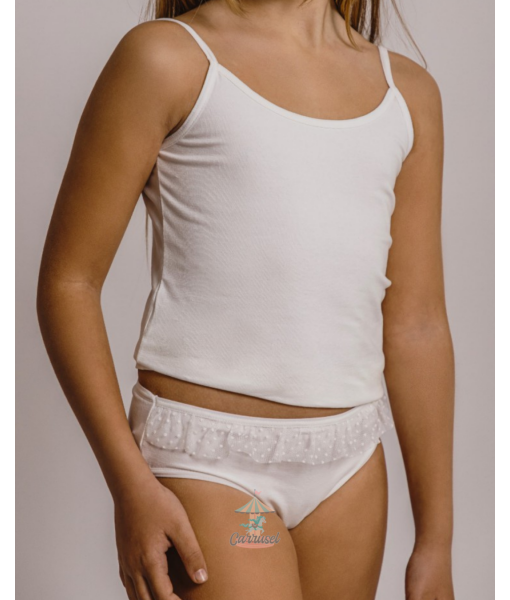 Conjunto interior de Comunión de dos piezas. Color blanco. Detalle de tira de tun en la braga. Espalda en V.