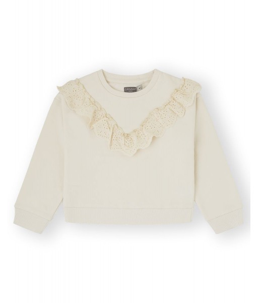 Sudadera de niña en color crudo, cuello redondo ribeteado, puños y bajo en canalé elástico y volantes bordados en la parte delantera.