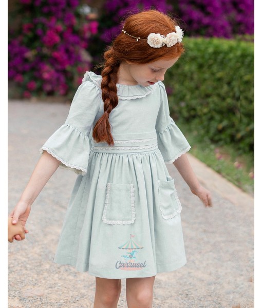 Vestido con media manga con volantes, dos bolsillos, cuello volante y fajín con lazo en la espalda. Color verde seco con tiras de encaje de color beige.