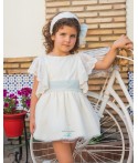 Vestido de manga sisa de plumeti con detalle de volantes en la manga y lazo de tul en la espalda. Color blanco con lazo de color celeste. También disponible con el tul en color rosa maquillaje y color verde jade.