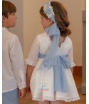 Un elegante vestido blanco con manga francesa, embellecido con volantes y un delicado detalle de puntilla, ofrece un toque sofisticado a cualquier ocasión especial. El diseño se completa con un fajín de tul en color celeste, adornado con un lazo, que añade un contraste sutil y encantador al conjunto, haciendo que cada niña luzca con gracia y distinción. Ideal para ceremonias, este vestido combina estilo clásico con detalles modernos, asegurando que las pequeñas brillen con luz propia.