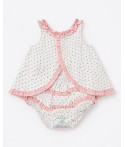 Compuesto por vestido y cubrepañal a juego, destaca por su estampado sutil y sus detalles en contraste. Los volantes en los tirantes y en el pecho aportan un toque encantador, mientras que el acabado en el bajo añade movimiento y un estilo muy cuidado.