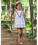 Jesusito con braguita con detalle de volante en la parte inferior. Detalle de volante en las magas y apertura en la espalda. Color gris y blanco de estampado safari.