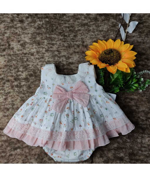 Vestido de plumeti y tirantas con estampado de florecillas. Color beige y salmón con detalle de lazo y tira de encaje.