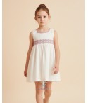 Vestido de manga sisa color blanco roto con detalles de tiras bordadas en el cuello y en la cintura en color blanco roto.
